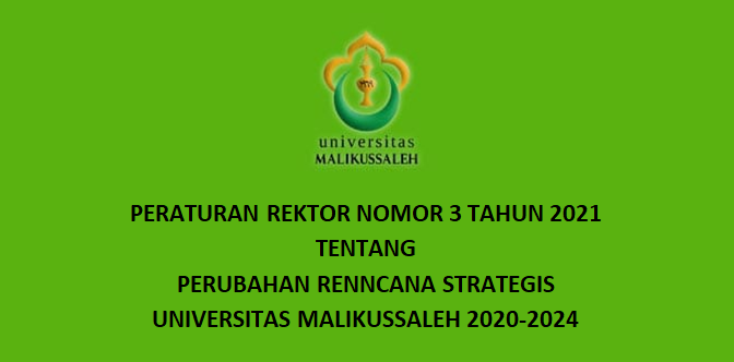 Rencana Strategis Unimal merupakan acuan dan pedoman dalam penyusunan rencana program, kegiatan dan anggaran Universitas Malikussaleh setiap tahun dalam rangka Pengembangan Universitas Malikussaleh pada periode 2020-2024, untuk itu perlu ditet...
